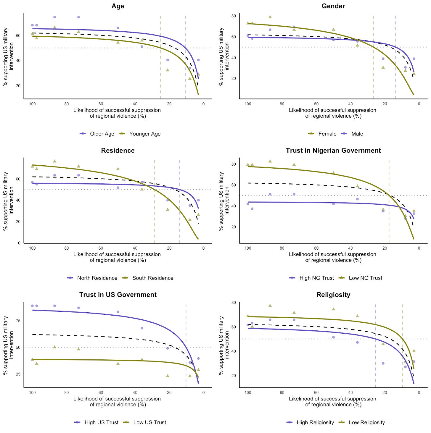 Religion: Religion plays a big part in the day-to-day lives of Nigerians, so, it was a bit difficult to split our participants into ‘high religiosity’ and ‘low religiosity’. We pulled it off by categorizing only those in the bottom 25% of perceived personal religiosity as ‘low’ (about one-third of respondents) and all others as ‘high’. That said, it was quite interesting that those in the low religiosity subgroup had higher demand for US military intervention at all likelihood levels. They were also more tolerant of a US military intervention with remote chances of succeeding (Low religiosity P50 = 9.68% vs High religiosity P50 = 25.47%). Perhaps the high religiosity subgroup do not think it is responsible to support a US military intervention if it is clear from the onset that it has a small chance of succeeding. Yet, that may only explain the differing P50s but not the lower demand found in the high religiosity subgroup at all levels.