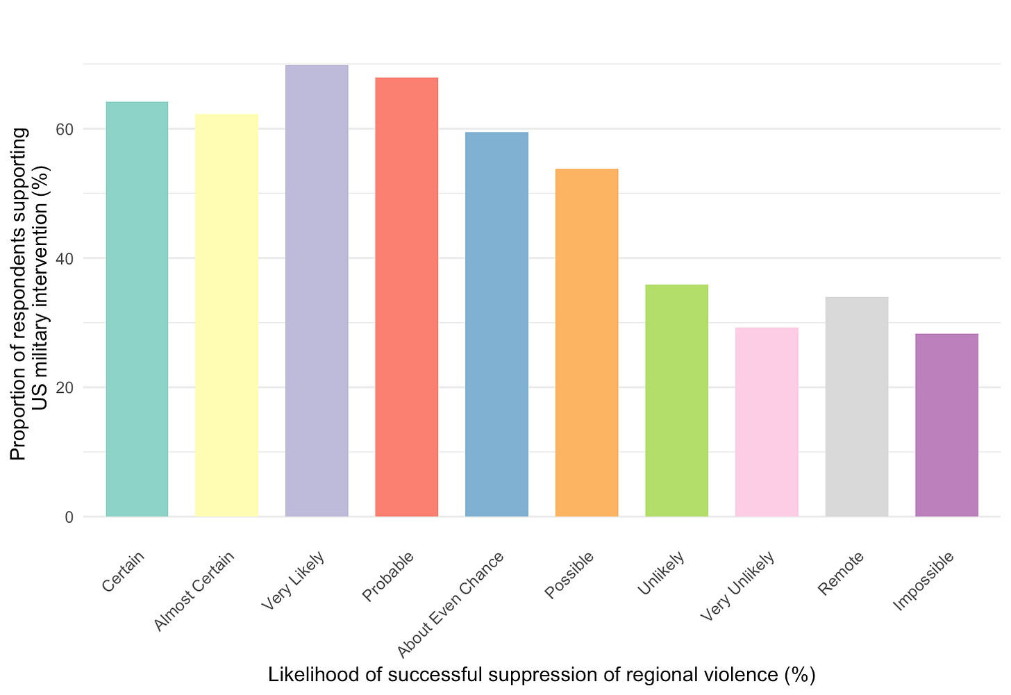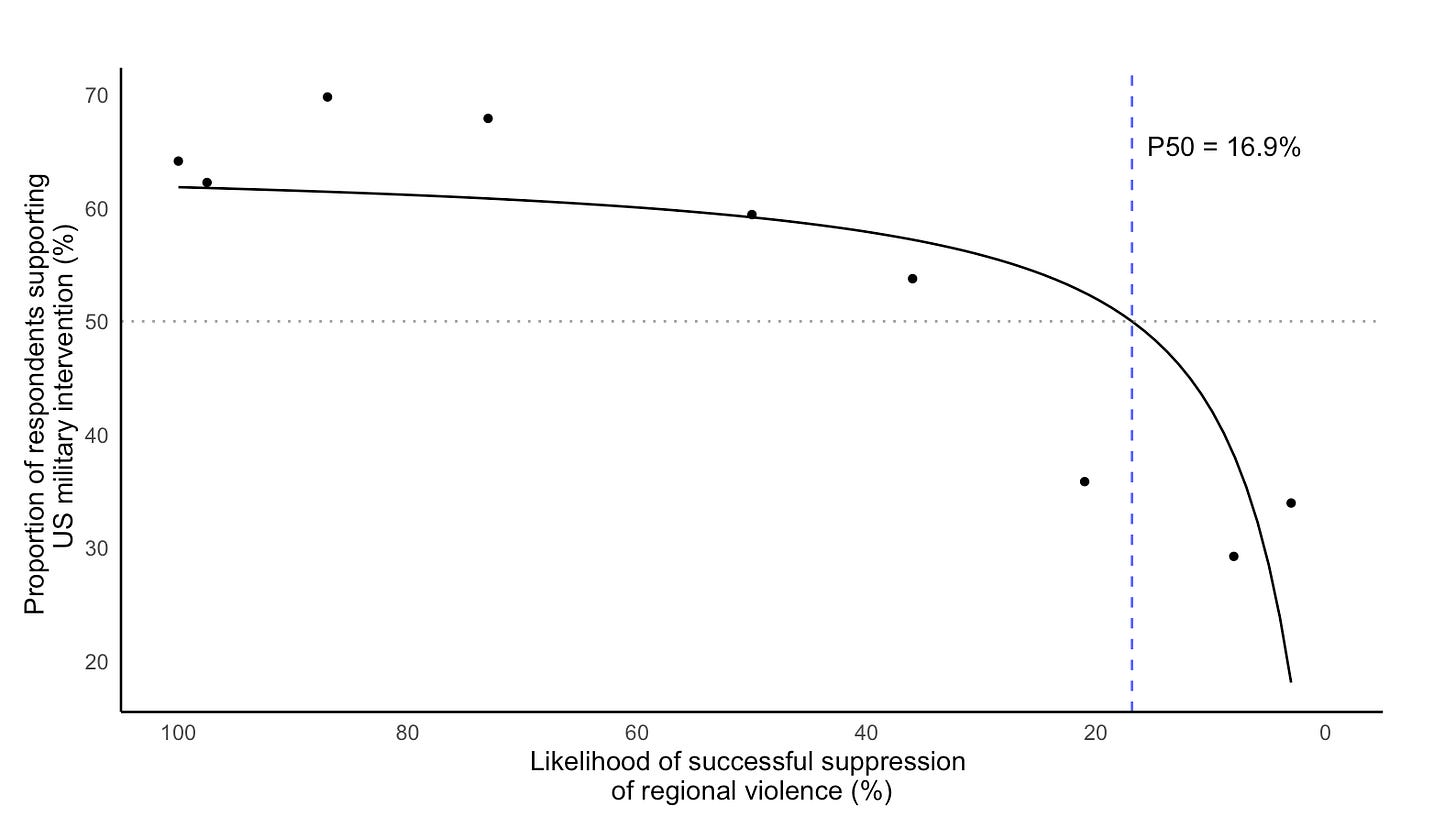 As you might expect, at higher likelihoods of success, many participants say ‘Yes’ and as the likelihoods decrease, more participants start to say ‘No’. We can also see the vertical dashed P50 line which, in this analysis, we are using as a proxy for measuring how much this group of participants will tolerate US military intervention even as the likelihood of its success drops.
