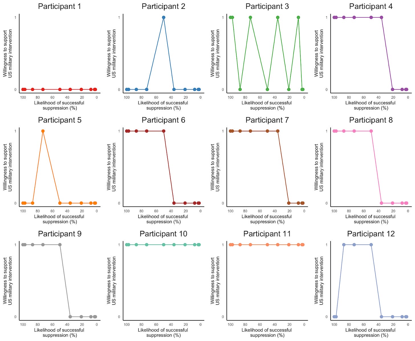 Participant 2 seemed to have interpreted the survey as asking about broad support for US military intervention, rather than support conditional on a range of likelihoods of successful outcomes from said intervention. When probed about his response, he said: “At 50%, an even chance, I will not support a full US military intervention because the outcome is uncertain, and I do not believe foreign intervention is the right solution for the interreligious violence. I only support limited US cooperation to help fight banditry and Boko Haram, not a broad intervention. ”