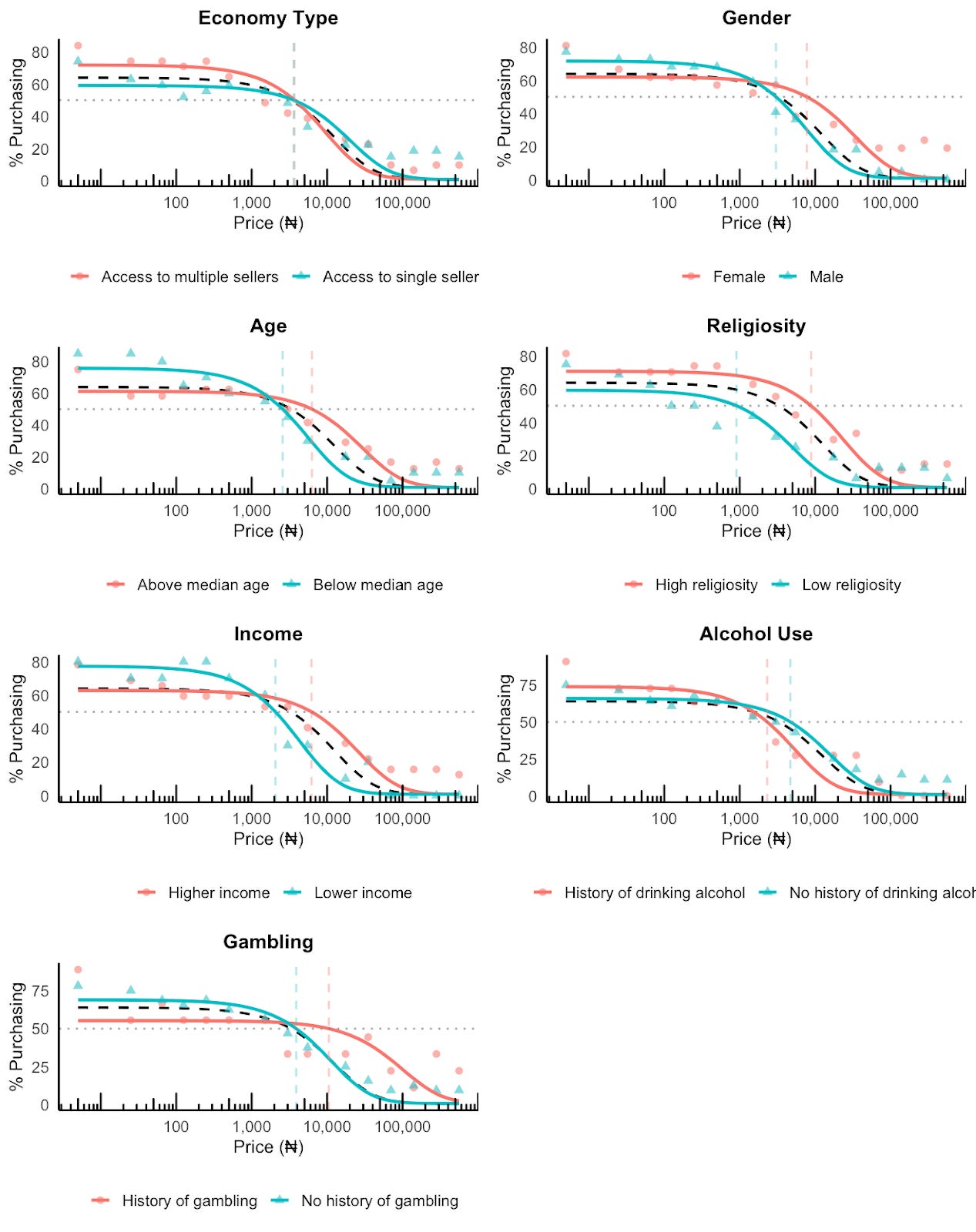 Income: As expected, higher-income respondents had a P50 (₦6,201.31; ≈$4.13) roughly three times that of lower-income respondents (₦2.062.11; ≈$1.37). That said, at very low prices, a higher proportion of lower income earners responded ‘Yes’ compared to higher income earners.