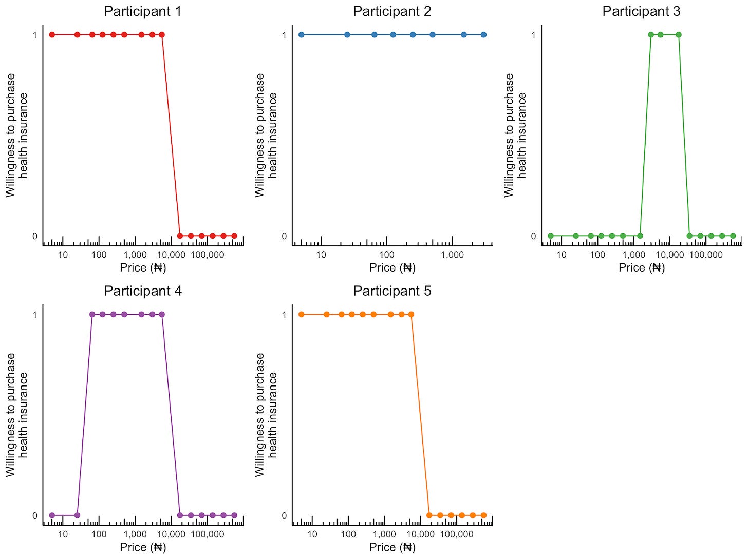 As you can see, Participant 1 and 5 had demand curves similar to what we had at the aggregate level. That is, when the price of health insurance was low, there was a strong willingness to purchase it. And after a certain threshold price was crossed (₦5,500/≈$3.67 for Participant 1 and ₦17500/≈$11.67 for Particpant 5), demand dropped to zero.