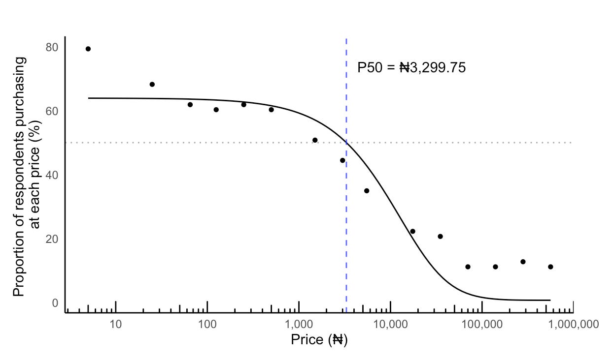 At PROMISE Labs Africa, we approached this problem from a different angle. We designed a short survey presenting 15 different monthly insurance price points ranging from ₦5 (less than $0.01) to ₦560,000 (a little more than $370). For each price, we asked our Nigerian respondents whether or not they would be willing to purchase insurance coverage for themselves.