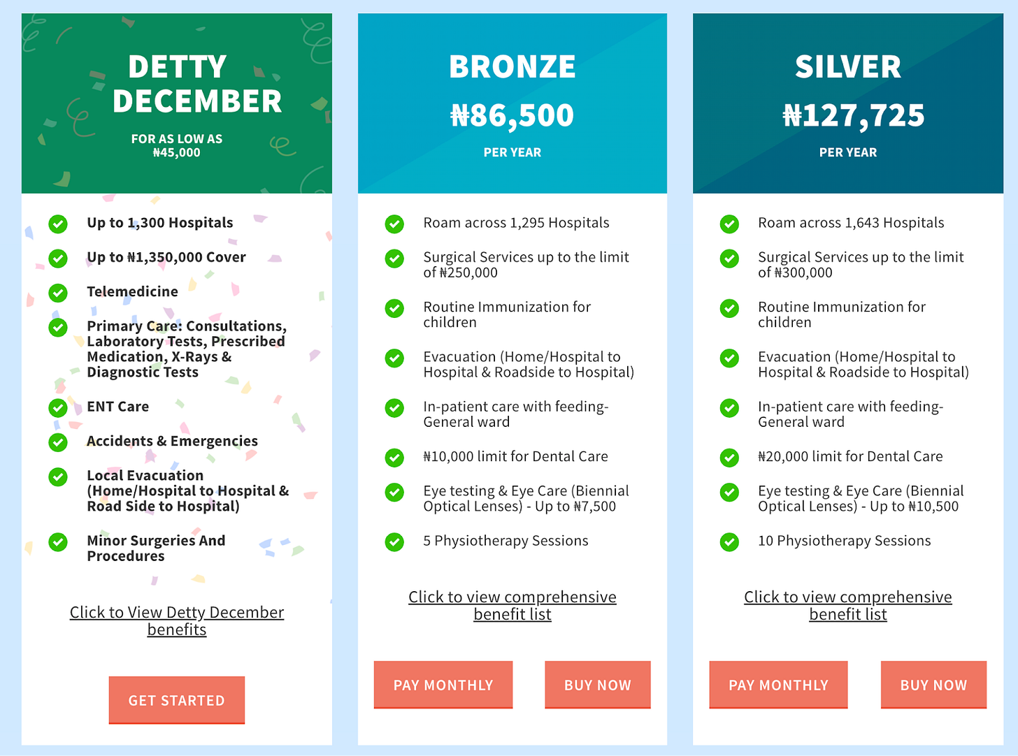For this sample, P50 was ₦3,299.75 (≈ $2.20), which translates to roughly ₦39,600 per year (≈$26.40/year). For comparison, Figure 2 shows the three lowest yearly plans on a private Nigerian insurance platform, AXA Mansard, gradually gaining popularity.
